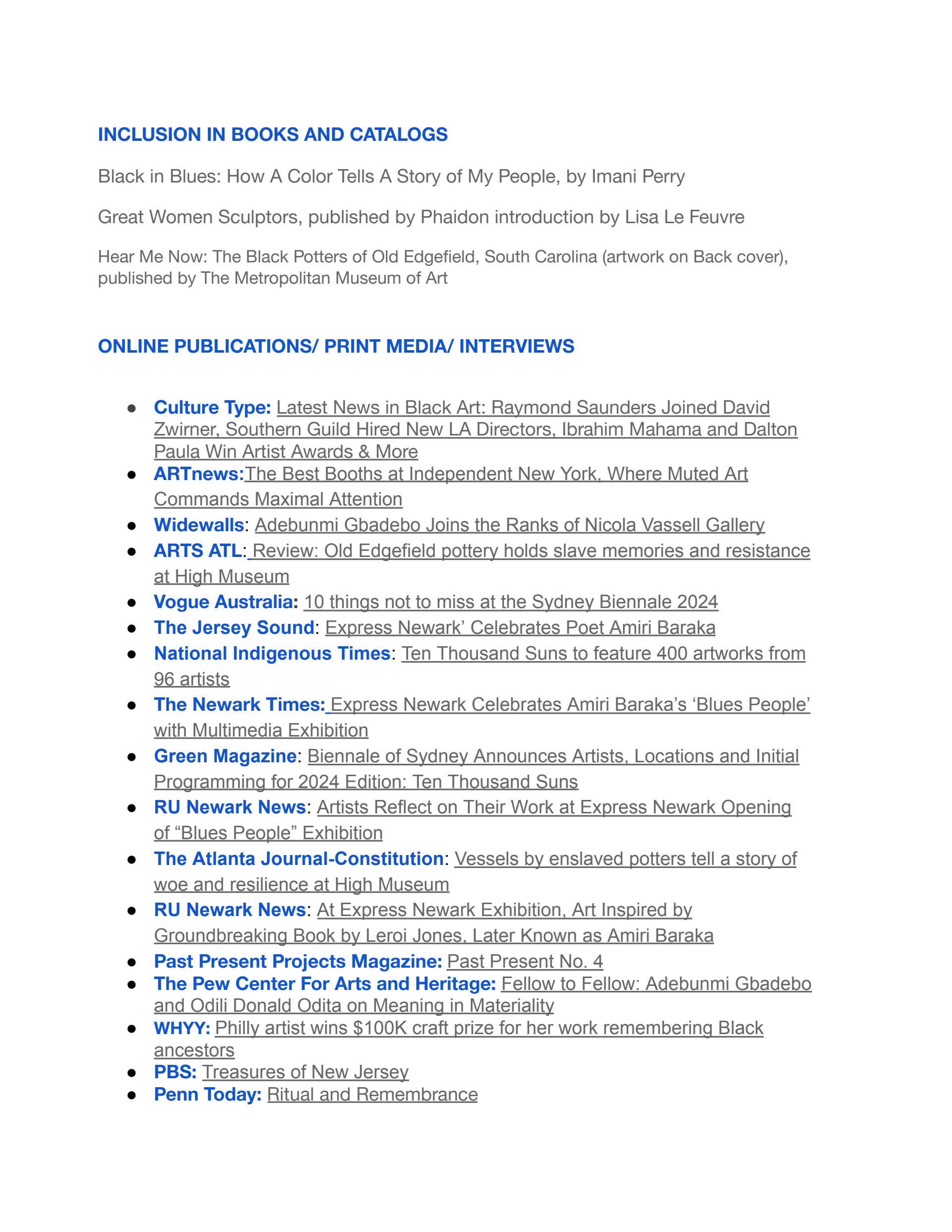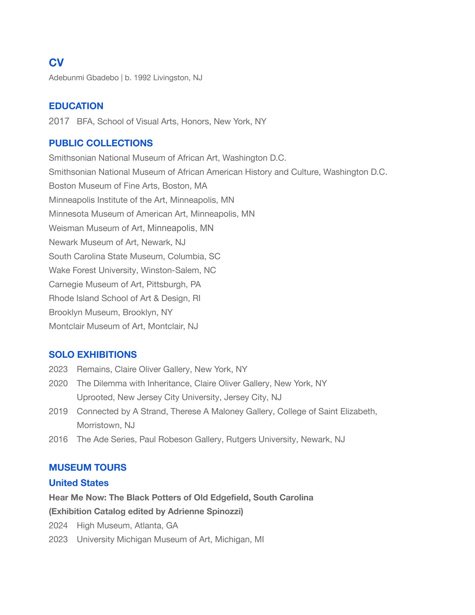In 2023, she was the recipient of the Maxwell and Hanrahan Craft Fellowship and the Keynote speaker for the American Ceramic Circle annual conference. In 2022, she was a Pew Fellow at the Pew Center for Arts & Heritage. Gbadebo is currently an Artist in Residence at The Clay Studio and has been featured in solo exhibitions at Claire Oliver Gallery, New York, NY; New Jersey City University, Jersey City, NJ; Therese A. Maloney Gallery, College of Saint Elizabeth, Morristown, NJ; and Paul Robeson Gallery, Rutgers University, Newark, NJ.