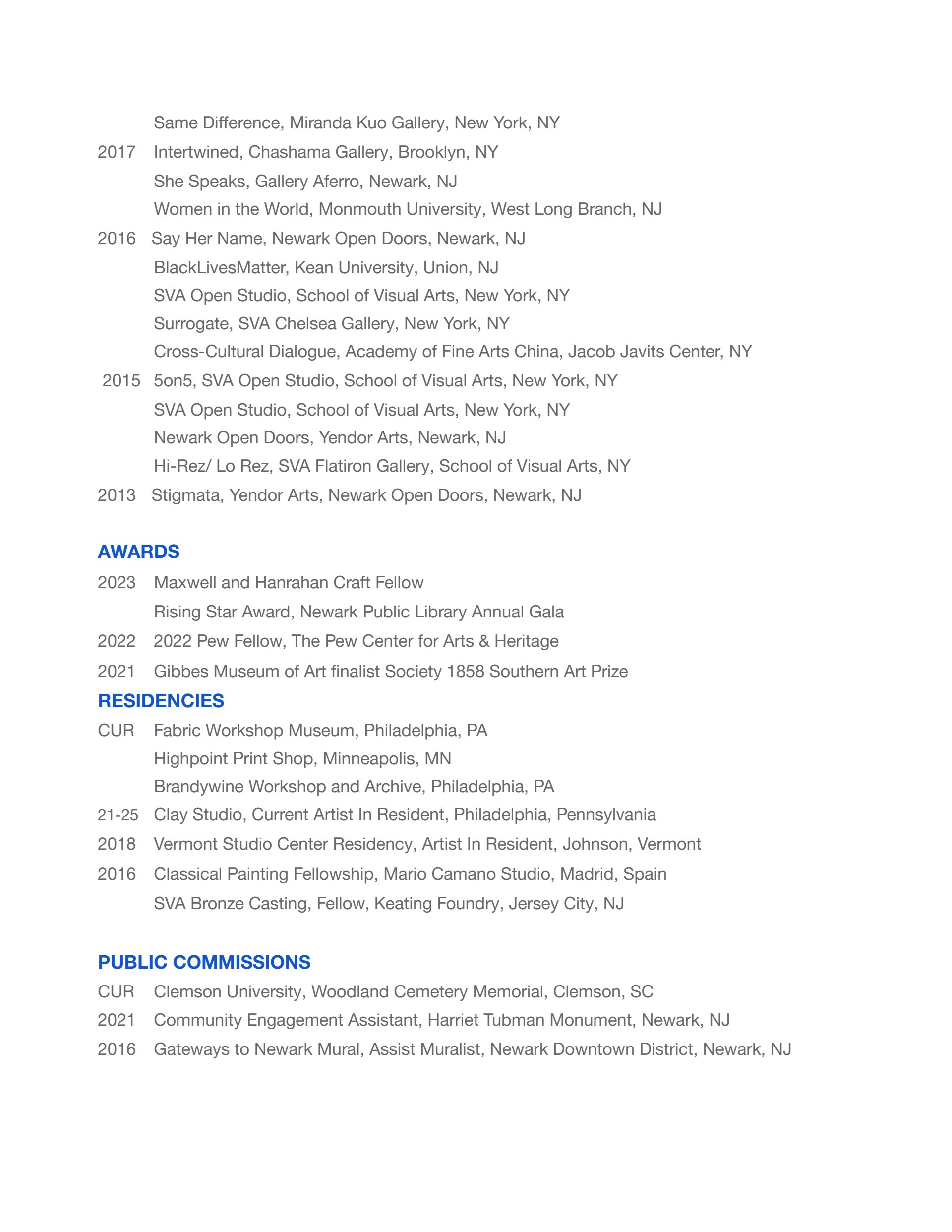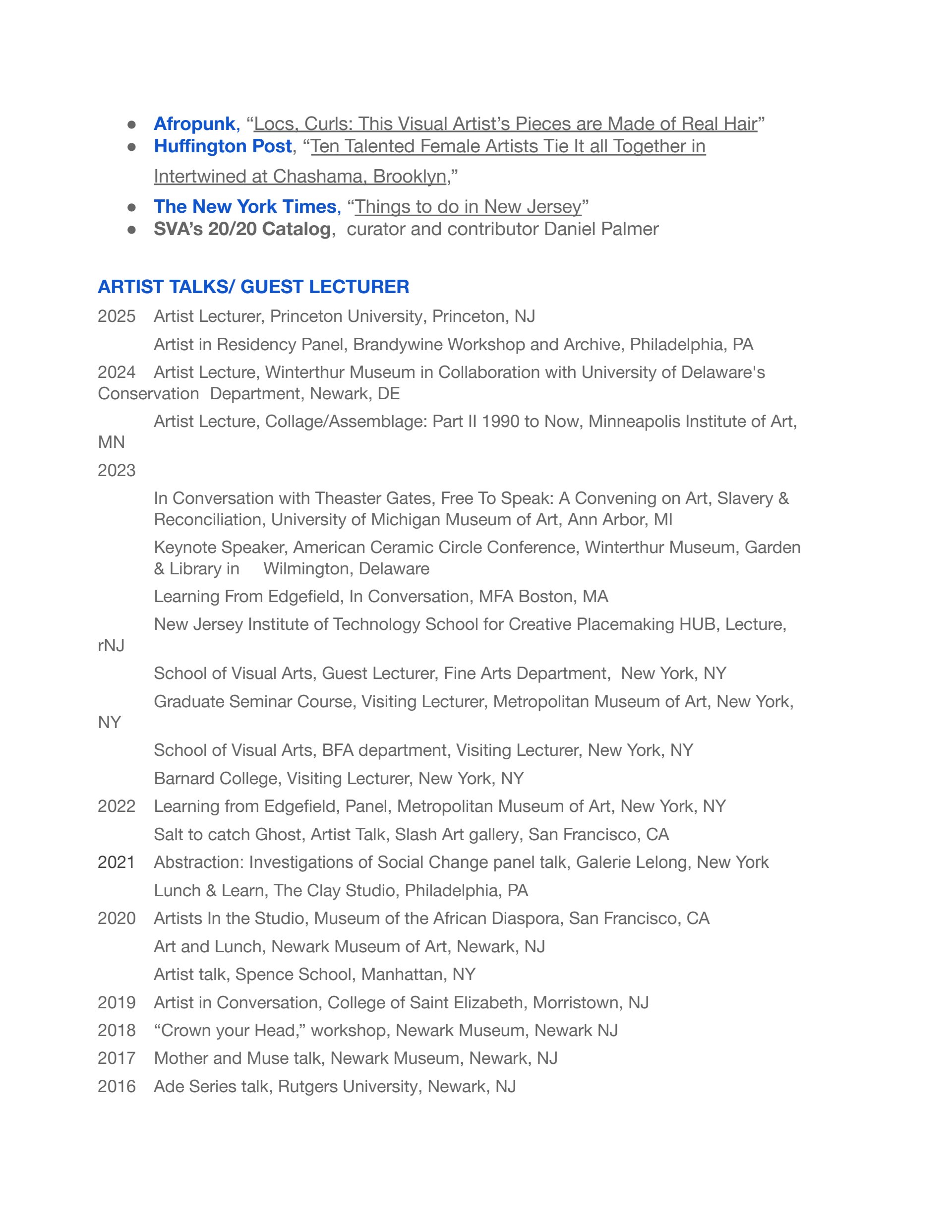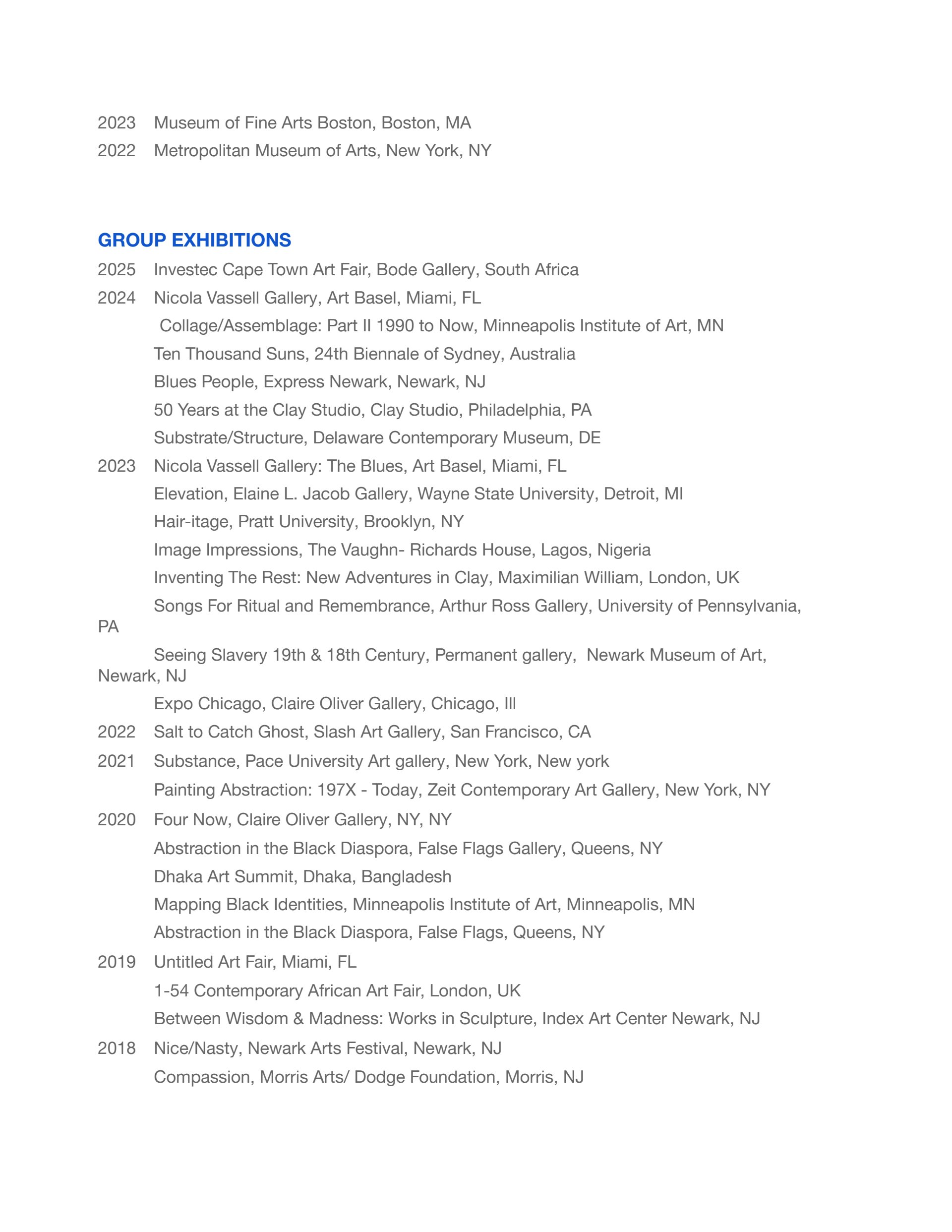 She has exhibited in group shows across the US and internationally in Africa, Europe, Asia and Australia. Her work has been now on view in major exhibitions such as the 24th Sydney Biennale: Ten Thousand Suns; Minneapolis Museum of Art: Collage/Assemblage Part II: 1990-Now; and Hear Me Now: The Black Potters of Old Edgefield, South Carolina, which opened at the Metropolitan Museum of Art, New York, in 2022, and has traveled to the Museum of Fine Arts Boston, University of Michigan Museum of Art, and is now at the High Museum of Art in Atlanta until May 12, 2024.