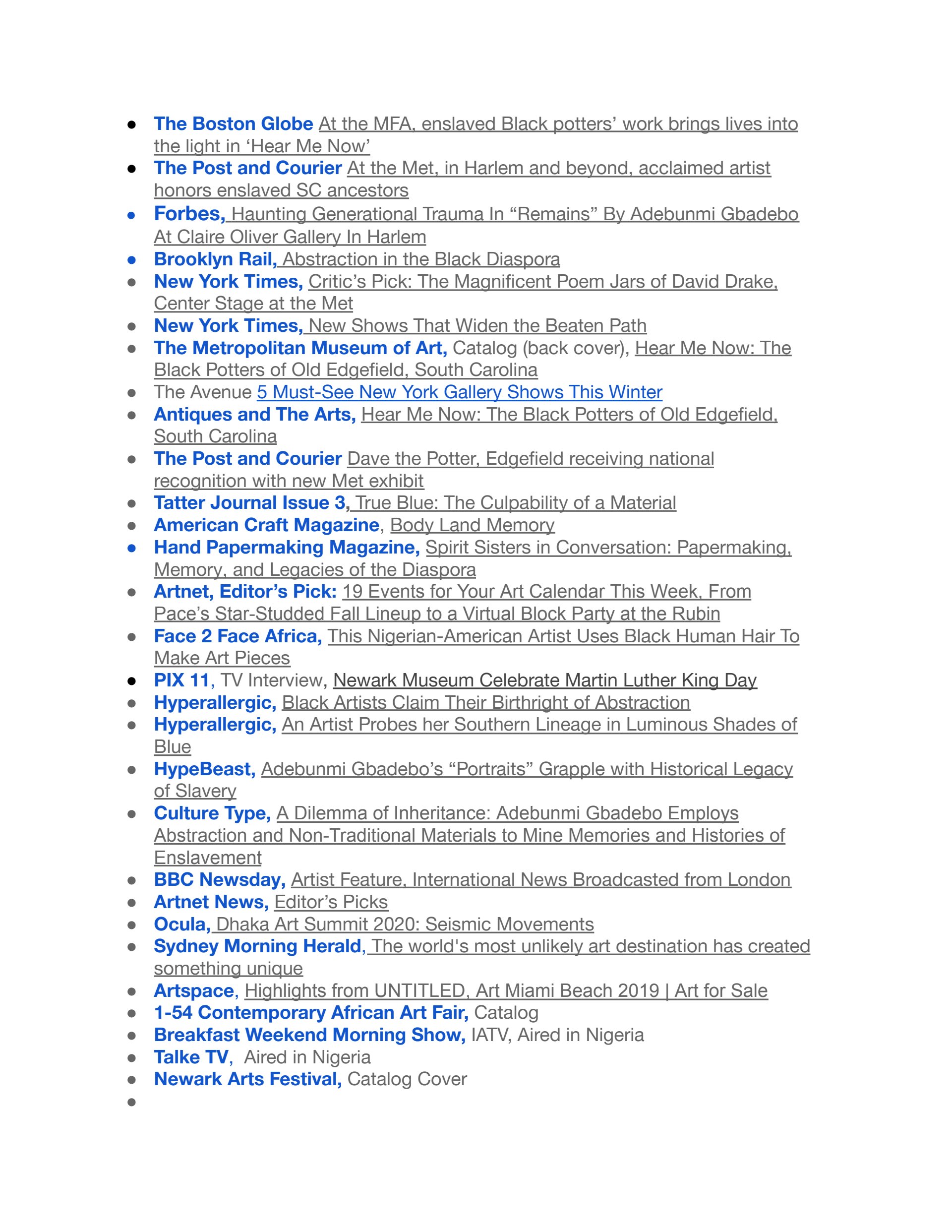 The artist has been featured in publications including the New York Times, Hyperallergic, Hypebeast, Brooklyn Rail, Forbes, The Art Newspaper, and The American Craft Council Magazine. Gbadebo is represented by Nicola Vassell Gallery in New York.