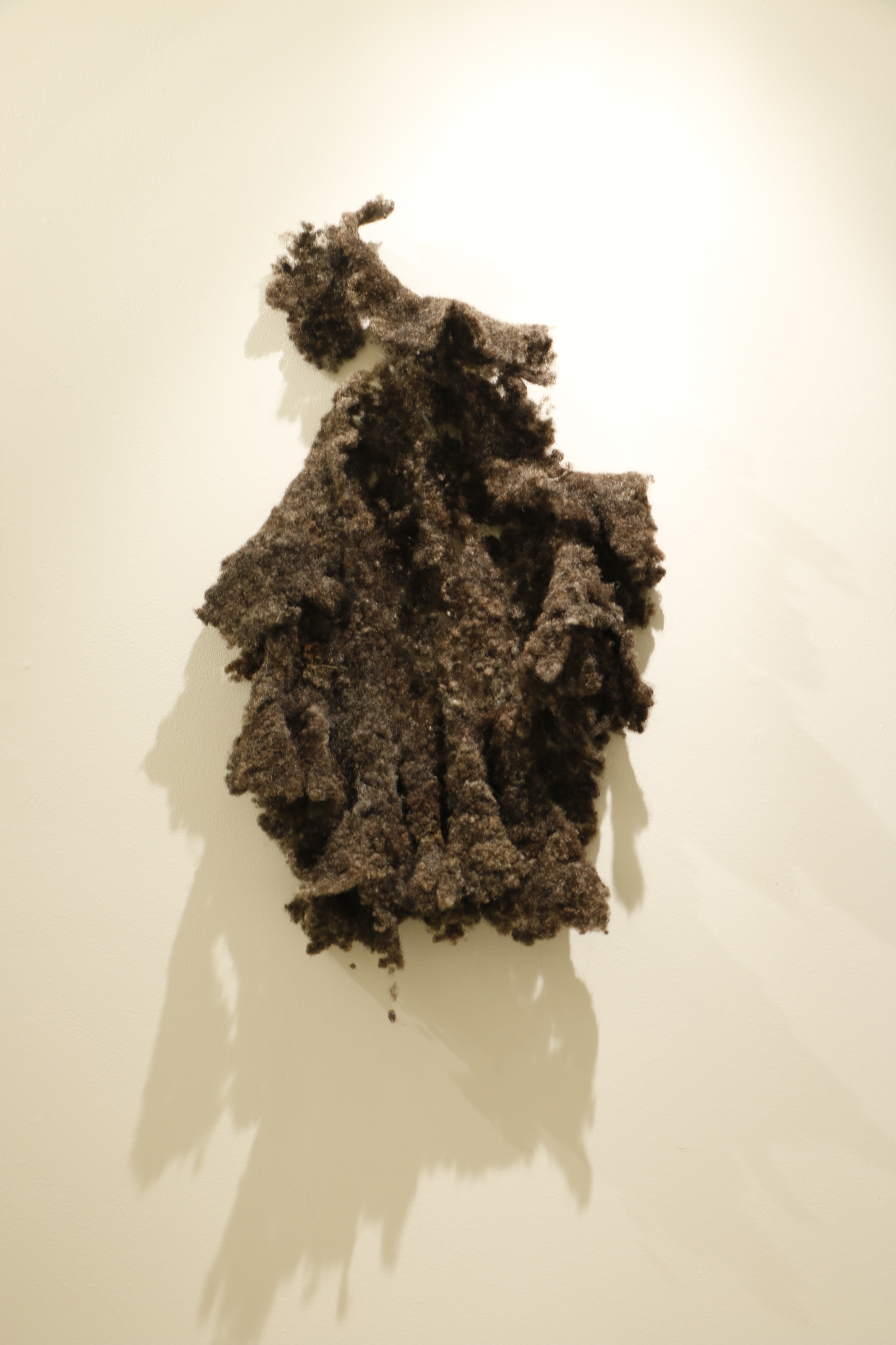 This hair belonged to Andrea Johnson who kept her hair in locs for twenty years. Ending her loc journey, she combed out her locs which took her months and gave the artist the broken hairs from that process. Gbadebo wanted to create something that honoured what the hair use to be, “dread” locs, while also acknowledging what the hair is now, loose strands of natural hair. So she felt the hair back together to form a single loc.