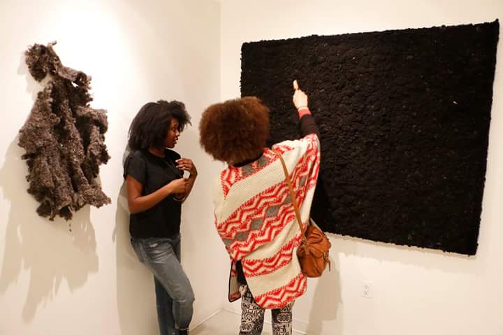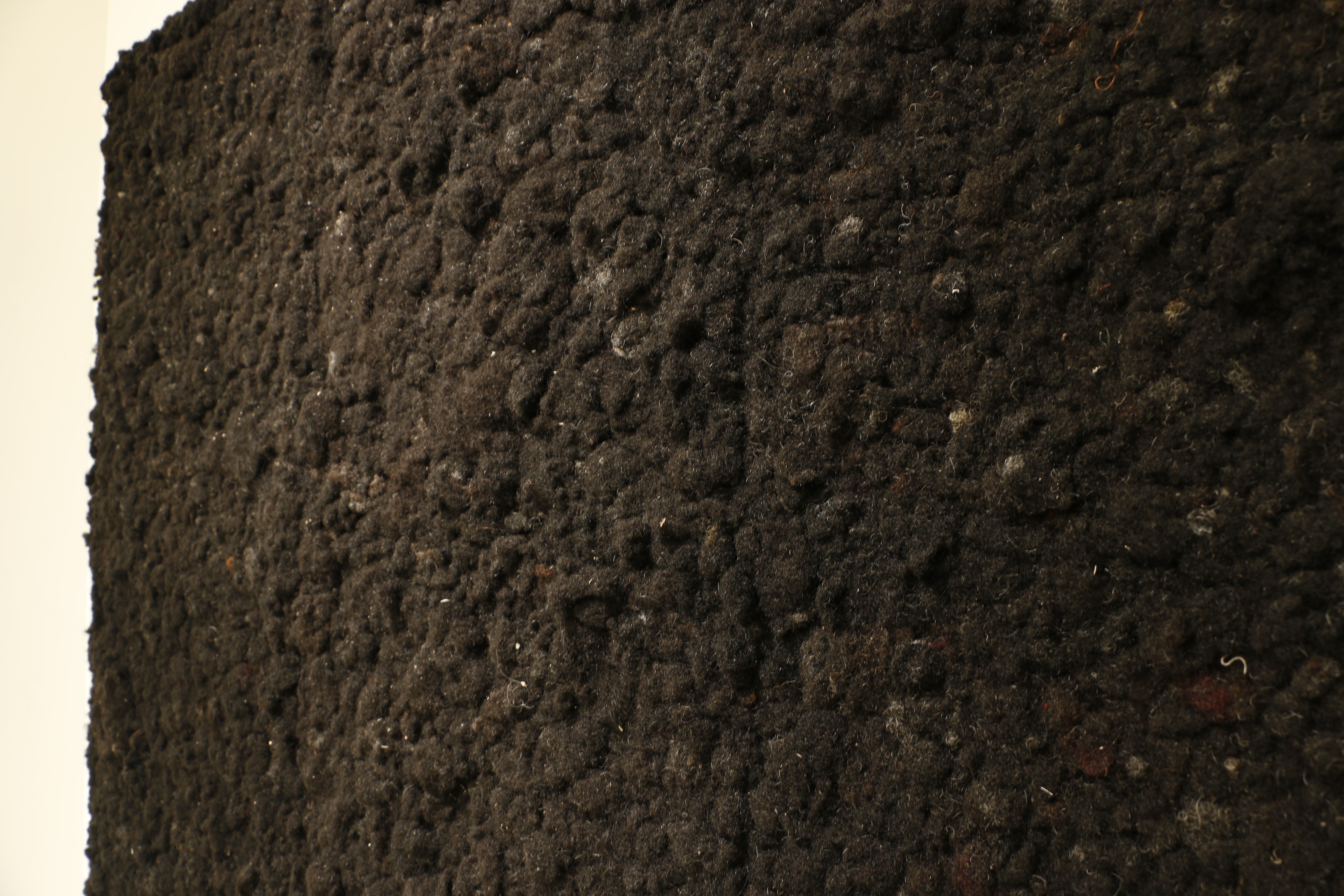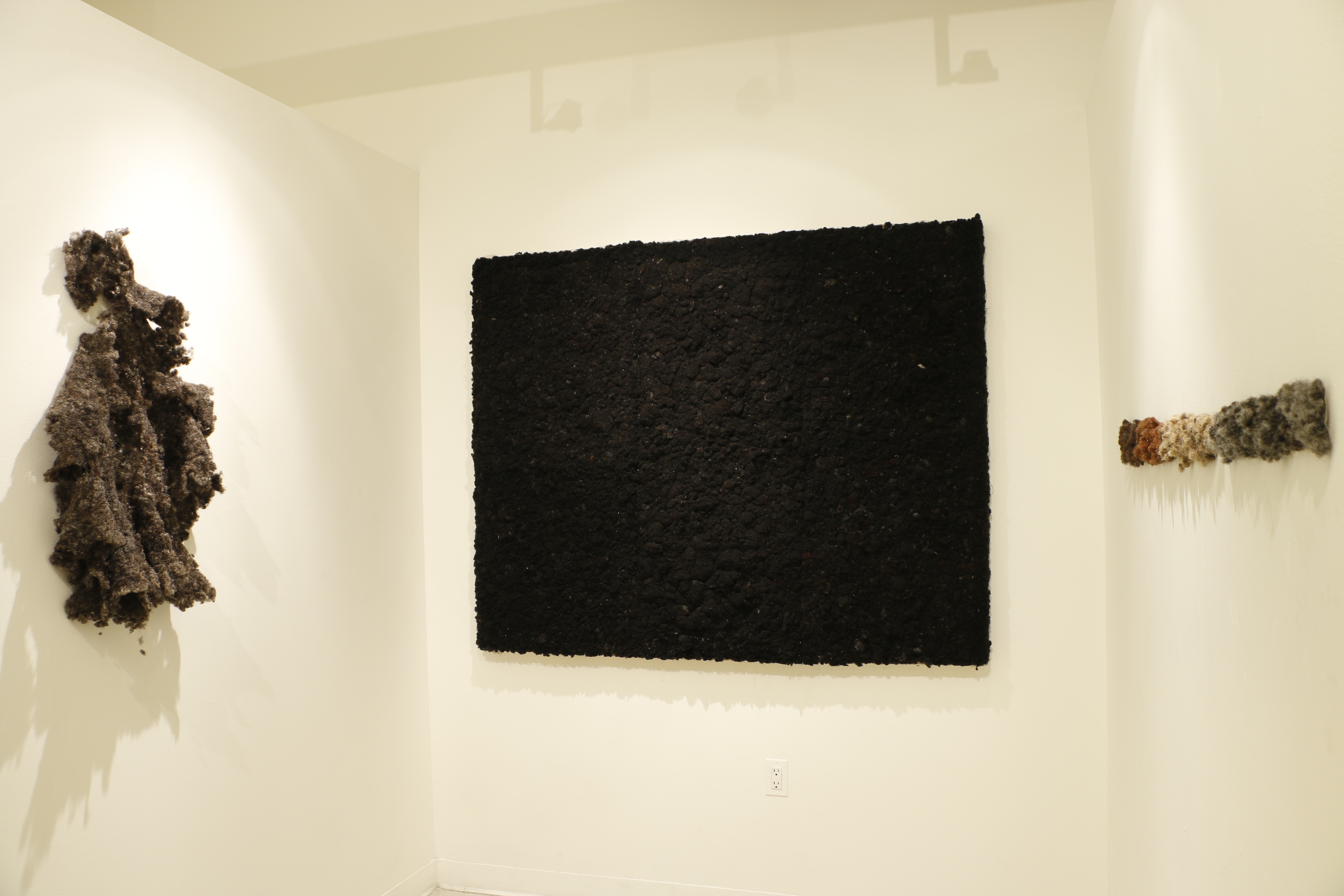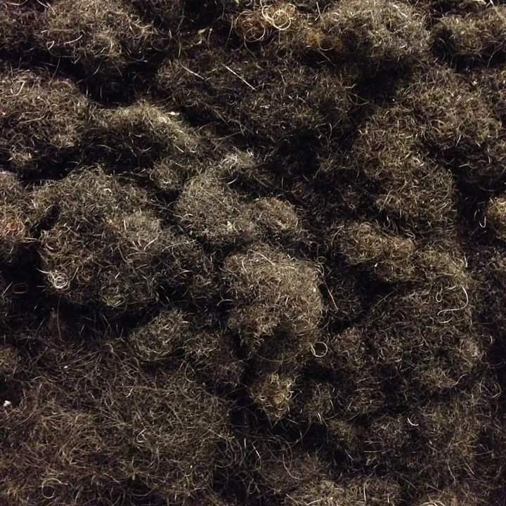 human hair from barbershops sewn to canvas, razor blades, matte medium