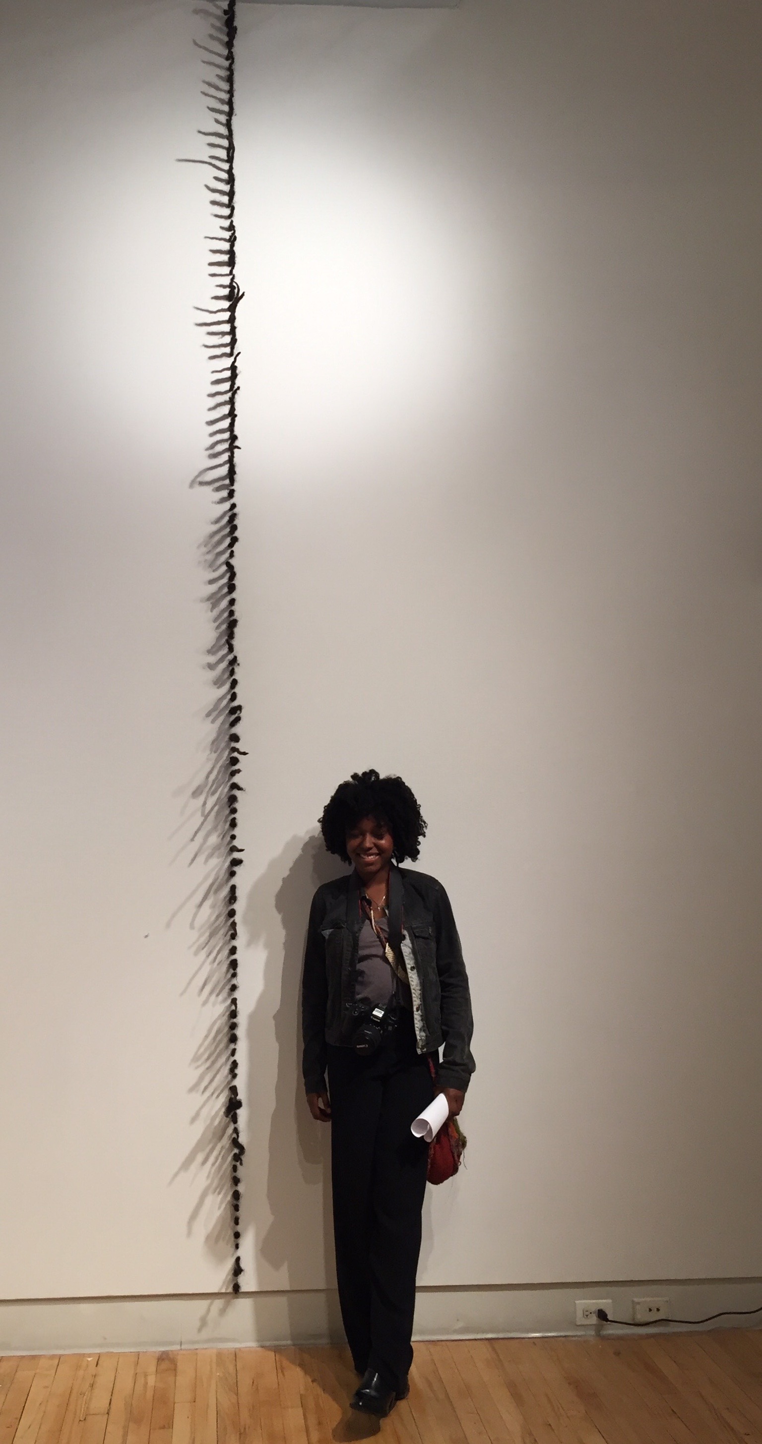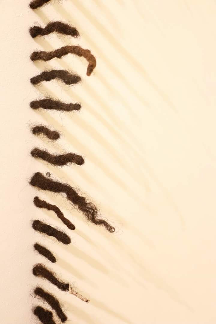 In the western art world, the word “Dada” refers to the European art movement of the early 20th century. The Dada art movement was a movement of rejection and questioning of society and art. In this work, the artists use this title as a sort of code switch. On one hand, the piece speaks to ideas of the Dada movement, as the artists have rejected traditional art materials and inserted afro locs from people in her community. Contrastingly, the piece also speaks to the Yoruba origins of the word.