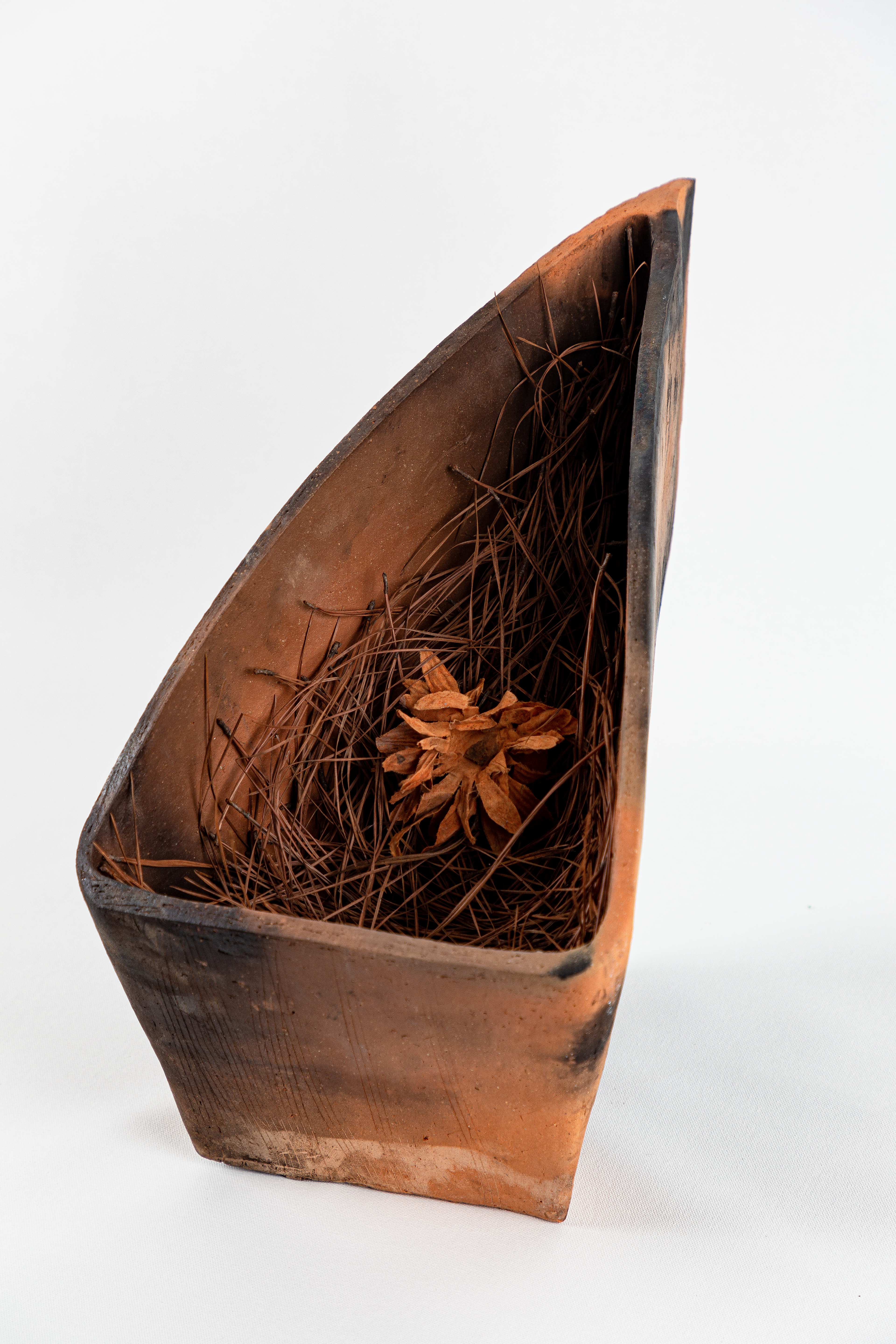 soil from True Blue Plantation (Fort Motte, South Carolina), Loblolly pine needles, artificial flower, pit-fired