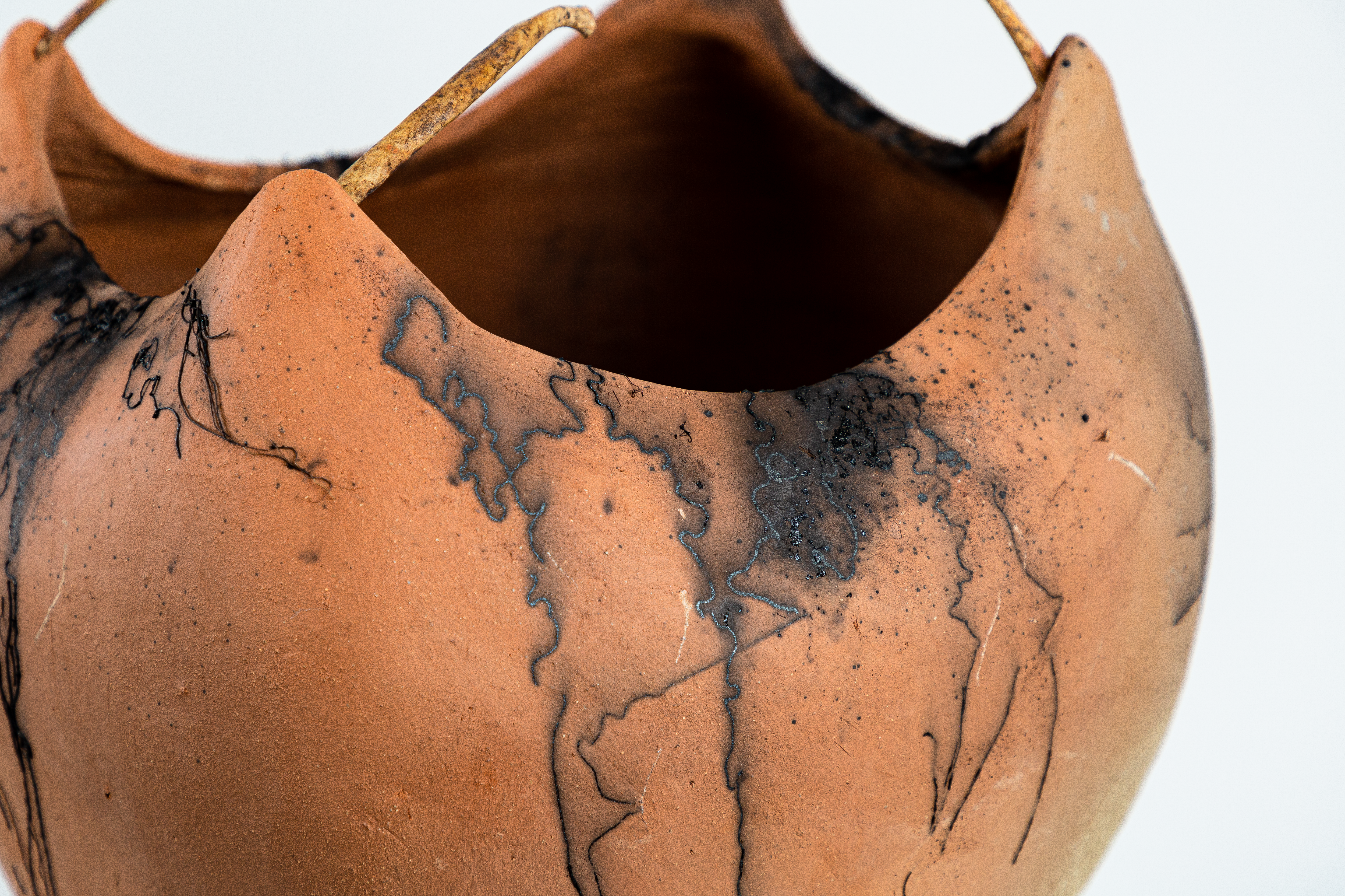 soil from True Blue Plantation (Fort Motte, South Carolina), human hair, afro locs, horse hair, sugar, Raku-fired